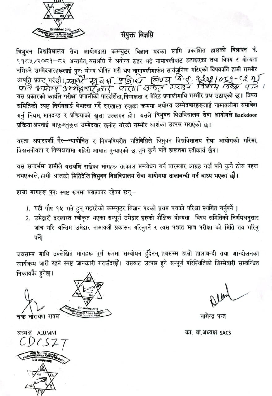 त्रिवि सेवा आयोगमा तालाबन्दी: कम्प्युटर विज्ञानको परीक्षा स्थगित गर्न माग