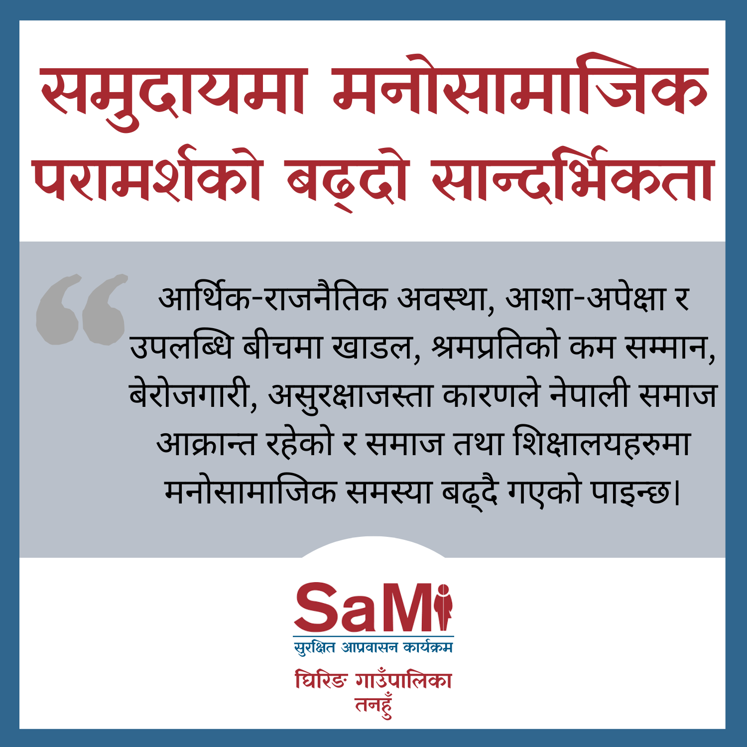 मन र सामाजिक वातावरण बीच सन्तुलन कायम नहुने थुप्रै कारणहरू छन्, जसका कारणले मनोसामाजिक समस्या पैदा गर्दछ। त्यस्तै आर्थिक- राजनैतिक अवस्था, आशा-अपेक्षा र उपलब्धि बीचमा खाडल, श्रमप्रतिको कम सम्मान, बेरोजगारी, असुरक्षाजस्ता कारणले नेपाली समाज आक्रान्त रहेको र समाज र शिक्षालयमा मनोसामाजिक समस्या बढ्दै गएको पाइन्छ। अन्त्यमा मनोसामाजिक परामर्श समुदायस्तरमा अति आवश्यक रहेको तर त्यस्तो जनशक्ति अझै अभाव रहेको छ। त्यस्तो जनशक्ति तयार गरी परिचालन गर्न, तिनै तहको सरकारले यस विषयमा जिम्मेवार भइ अपनत्व लिनुपर्दछ।